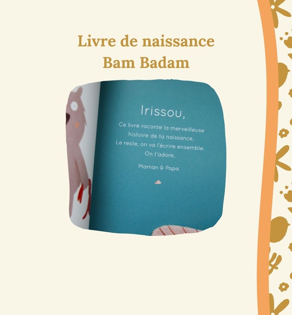 - Un livre de naissance de chez Bam Badam éditions, à personnaliser avec l'histoire unique bébé